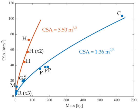 Values of the cross-sectional area (CSA) of knee anterior cruciate ligament for different species from the literature. C: cow, G: goat, H: human, M: monkey, P: pony, R: rabbit, S: sheep. In red, human values (bipeds), and in blue, quadrupeds. Blue and orange lines are the best-fit least-square regressions for humans and quadrupeds.