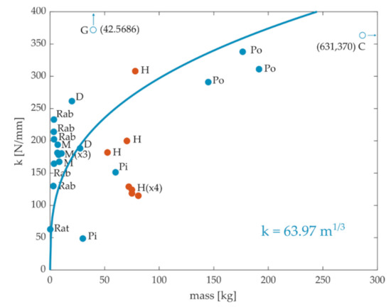 Stiffness of the anterior cruciate ligament (ACL) versus mass for different species obtained from the literature. C: cows, D: dogs, G: goats, H: humans, M: monkeys, Pi: pigs, Po: ponies, Rab: rabbits. There are two outliers in the plot, the stiffness values of the goats and the cows. The blue line is the best-fit least-square regression for the quadrupeds.