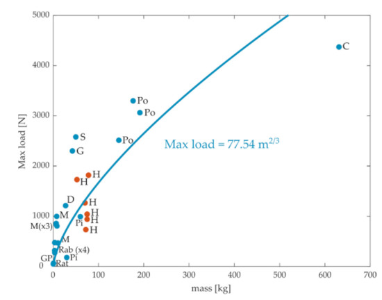 Maximum load before rupture of the ACL versus mass for different species obtained from the literature. C: cows, D: dogs, G: goats, GP: guinea pigs, H: humans, M: monkeys, Pi: pigs, Po: ponies, Rab: rabbits, S: sheep. The blue line is the best-fit least-square regression for the quadrupeds.