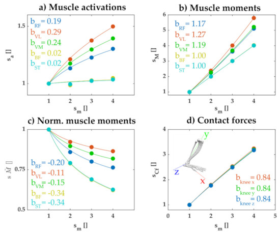Scale factors obtained for rectus femoris (RF), vastus lateralis (VL), vastus medialis (CM), biceps femoris (BF), and semitendinosus (ST). These muscles are illustrated since they reflect the main muscles acting at the knee joint in these simulations. The scale factors are obtained by dividing the maximum values of the variables through the trial by the maximum value at the lowest scale. Note that all scale factors start with a value of 1. The variables analyzed are: (a) muscle activations, (b) knee joint moments produced by each muscle, (c) muscle contribution to the knee joint moment, calculated as a fraction of the total knee joint moment, (d) knee contact forces in x, y, and z directions. b is the exponent of the fitted expression , where sx is the scale factor of the corresponding variable. Note that parameter a used for the fits in Figure 1, Figure 2 and Figure 3 is omitted, since it is equal to 1 in each plot here because all values are expressed relative to the simulation with body mass of 100 g.