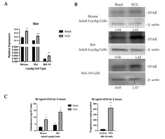STAR expression and levels in various models in the absence and presence of hormonal stimulation. (A). qRT-PCR analyses of Star mRNA expression in mouse, rat, and MA-10 Leydig cells under basal conditions and upon hCG stimulation. Gapdh was used as the housekeeping gene. Data are shown as the mean ± SEM (n = 3). (B). Western blot analyses of STAR protein levels in mouse, rat, and MA-10 Leydig cells under basal conditions and upon hCG stimulation. Quantification was performed by calculating the ratio of the density of the STAR band to that of β-actin through ImageJ. Quantification is shown below each immunoblot. (C). ELISA analyses of testosterone production by mouse and rat Leydig cells (left) and progesterone production by MA-10 cells (right) in cell media following stimulation with 50 ng/mL hCG for 2 h. Data are shown as the mean ± SEM (n = 3 for mouse; n = 2 for rat). * p < 0.05; ** p < 0.01; *** p < 0.001.