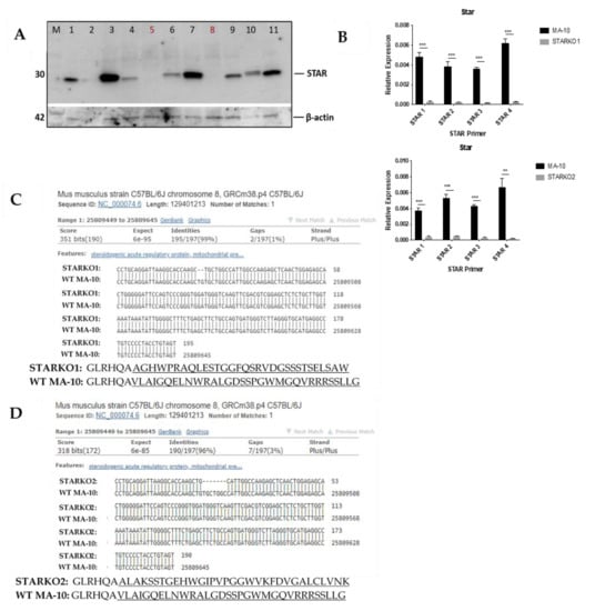 Screening and validation of CRISPR/Cas9-mediated STAR KO in MA-10 cells. (A) Western blot screening for STAR KO cell line following CRISPR/Cas9-mediated STAR KO and FACS. Samples in lane 5 (STARKO2) and lane 8 (STARKO1) show no STAR band and, therefore, are STAR KOs. (B) qRT-PCR analyses of STARKO1 and STARKO2 where Gapdh was used as the housekeeping gene. STAR 1, STAR 2, STAR 3, and STAR 4 are primers for various regions of the mouse Star gene. Data are shown as the mean ± SD (n = 3). ** p < 0.01; *** p < 0.001. (C) BLAST DNA sequence of Star in STARKO1 cells (top) compared to wild-type mouse Star (bottom). Dashes represent nucleotide deletions. Amino acid sequence of wild-type STAR (top) compared to that of STARKO1 (bottom). Highlighted amino acids represent sequence changes. (D) BLAST DNA sequence of Star in STARKO2 cells (top) compared to wild-type mouse Star (bottom). Dashes represent nucleotide deletions. Amino acid sequence of wild-type STAR (top) compared to that of STARKO2 (bottom). Underlined amino acids represent sequence changes.