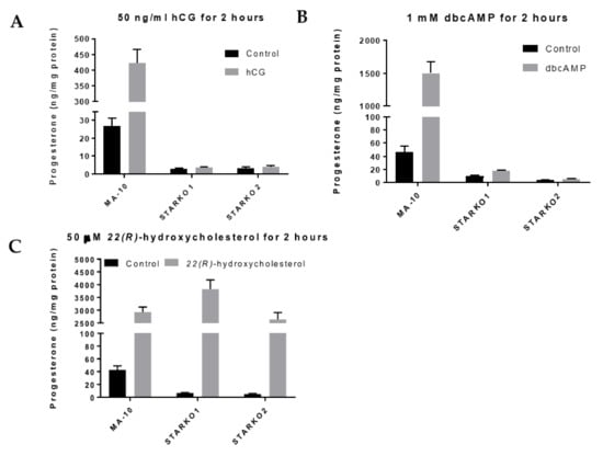 Progesterone production by wild-type MA-10 and STAR KO cell lines in response to stimulus. (A) ELISA analyses of progesterone levels in cell media following stimulation with 50 ng/mL hCG for 2 h. (B) ELISA analyses of progesterone levels in cell media following stimulation with 1 mM dbcAMP for 2 h. (C) ELISA analyses of progesterone levels in cell media following stimulation with 50 μM 22(R)-hydroxycholesterol for 2 h. Data are shown as the mean ± SEM (n = 3).