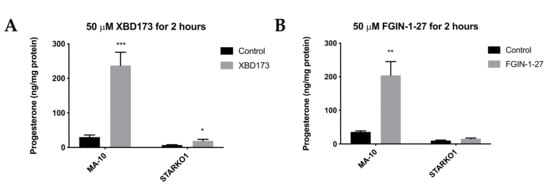We next sought to determine whether STAR KO affects TSPO-mediated steroidogenesis. TSPO drug ligands such as XBD173 and FGIN-1-27 have been shown to induce steroidogenesis in the absence of hormonal stimulation, but in the presence of basal levels of STAR [10,11]. Since STAR KO cells lack constitutive STAR, we sought to determine whether TSPO ligand-induced steroidogenesis acts independently of STAR. MA-10 and STAR KO cells were treated with 50 μM XBD173 or 50 μM FGIN-1-27 for 2 h and progesterone production was measured by ELISA. Results showed that XBD173 stimulates progesterone production in MA-10 cells, but that progesterone production is not induced to levels similar to WT MA-10 cells when STAR is absent (Figure 4A). Although progesterone production was not induced in STARKO1 cells to the extent of WT MA-10 cells, XBD173 caused a small but significant increase in progesterone produced by STARKO1 cells compared to control STARKO1 cells (Figure 4A). Treatment with FGIN-1-27 also showed that progesterone production is not induced to levels similar to WT MA-10 cells when STAR is absent (Figure 4B). However, there was no difference in progesterone produced between control and FGIN-1-27-treated STARKO1 cells. These results suggest that constitutive STAR, or STAR that is present independent of hormonal stimulation in MA-10 cells but absent in STAR KO cells, plays a role in TSPO-mediated steroidogenesis.