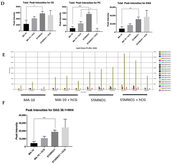 Alterations in lipid droplet content between WT MA-10 and STARKO1 cells. (A) Bodipy 493/503 staining of lipid droplets in MA-10 (left) and STARKO1 (right) cells with quantification shown to the right. Scale bar: 10 μm. (B) Electron microscopy images of lipid droplets in WT MA-10 cells (left) and STARKO1 cells (right). Arrows point to lipid droplets. (C) Peak intensities of various lipid classes identified in lipid droplets of wild-type MA-10 and STARKO1 cells in the absence and presence of hormonal stimulation. (D) Peak intensities of lipid classes shown to be significantly altered between lipid droplets of wild-type MA-10 and STARKO1 cells in the absence and presence of hormonal stimulation. (E) Peak intensities of individual diacylglycerol (DAG) species identified in lipid droplets of MA-10 and STARKO1 cells. (F) Peak intensities of DAG 38:1 in lipid droplets of MA-10 and STARKO1 cells in the absence and presence of hormonal stimulation. Data are shown as the mean ± SEM. * p < 0.05; ** p < 0.01; *** p < 0.001.
