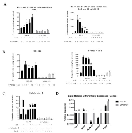 Role of DAG signaling in progesterone production by WT MA-10 and STARKO1 cells. (A) ELISA analyses of progesterone levels in cell media following treatment with varying concentrations of the DAG analog OAG in the absence (left) and presence (right) of 50 ng/mL hCG for 2 h. (B) ELISA analyses of progesterone levels in cell media following treatment with varying concentrations of PLC inhibitor U73122 in the absence (left) and presence (right) of 50 ng/mL hCG for 2 h. (C) ELISA analyses of progesterone levels in cell media following treatment with 1 μM of PKC inhibitor calphostin C in combination with 50 ng/mL hCG and/or 50 μM OAG for 2 h. (D) qRT-PCR analyses of lipid-related differentially expressed genes. Data are shown as the mean ± SEM (n = 3). * p < 0.05; ** p < 0.01; *** p < 0.001.