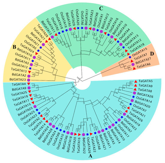 Phylogenetic tree of GATA proteins from Brachypodium distachyon, rice, and wheat. Phylogenetic relationships of GATA proteins from Brachypodium distachyon (28), rice (26), and wheat (29) were performed with MEGA v5.0 using the NJ method with 1000 bootstrap replicates. The GATA proteins were clustered into four major groups—A, B, C, and D. Members of B. distachyon, rice, and wheat are represented by purple circles, blue stars, and red triangles, respectively. Gene IDs of GATAs from B. distachyon, rice and wheat were listed in Table S2.