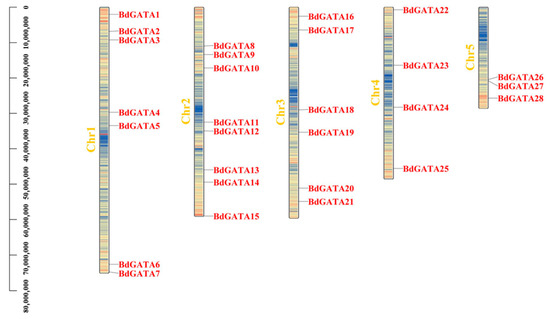 Chromosomal locations of BdGATA with gene density. The size of a chromosome is estimated from its relative length. The chromosome numbers are shown on the left of each chromosome. The gene density is indicated by the color bar (blue-to-red scale indicates gene density from low to high).