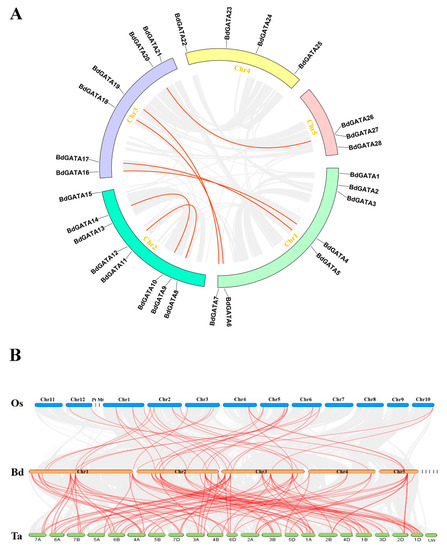 To further determine the chromosome position distribution of BdGATA genes, we utilized the tblastn program of the National Center for Biotechnology Information database to search for the nucleotide sequence of each BdGATA gene. The distribution of blast hits is shown in Figure 2. The GATA genes were non-uniformly distributed in the five chromosomes of B. distachyon, and there was no biological relevance between BdGATA gene number/density and the chromosome, the maximum of which is eight BdGATA genes existing on chromosome 2, with a minimum of three on chromosome 5 (Figure 2). For the vast majority of species, tandem and segmental duplication are the crucial evolutionary driving forces [21]. Therefore, we analyzed the tandem and segmental duplication characteristics of GATA genes and identified a BdGATA tandem duplication cluster (BdGATA26/BdGATA27). Moreover, seven BdGATA gene pairs were found as segmental duplication events (Figure 3A, Supplementary Table S3), which may partially contribute to GATA gene generation. The rate of nonsynonymous (Ka) to synonymous (Ks) substitution was used to evaluate the tendency and strength of natural selection action. The Ka/Ks values of all GATA gene pairs were less than 1.00 (0.28–0.90), which indicates that the GATA gene pairs in B. distachyon undergo intense purifying selection during the evolutionary process (Supplementary Table S3). Moreover, we also calculated the approximate date of duplication events. The duplication events of BdGATA genes occurred from 53.88 Mya (Ks = 0.700) to 89.75 Mya (Ks = 1.166), with a mean of 73.53 Mya (Ks = 0.955). To deduce the synteny of GATA genes, we conducted a collinearity analysis between B. distachyon and the other two cereal species (rice and wheat) using One Step MCScan. Consequently, 33 paired collinearity relationships between BdGATA (B. distachyon) and OsGATA (rice) genes were found, and there were 98 pairs between BdGATA and TaGATA (wheat) genes (Figure 3B). Detailed information of the synteny analysis, including gene pairs and chromosome locations, is shown in Supplementary Table S4.