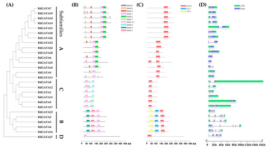 In order to analyze the evolutionary diversity of GATA genes, we constructed a comprehensive neighbor-joining phylogenetic tree for the three Gramineae species B. distachyon, rice (Oryza sativa L.), and wheat (Triticum aestivum L.), and the locus names of the GATA genes from these three are listed in Supplementary Table S2. The phylogenetic clustering analysis revealed that GATA genes were divided into four subgroups, named A to D according to their motifs (Figure 1). Among them, group A accounted for over half of the total (53.5%) and group D for only one member (BdGATA27) of B. distachyon. Group B contained the integrated conserved domain (GATA/CCT/TIFY); however, group D lacked some motifs. Consistently, the vast majority of GATA proteins within the same group had similar physicochemical characteristics, as shown in Table S1.