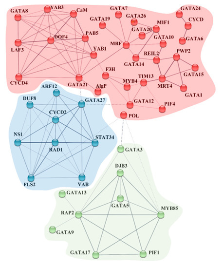To further reveal the potential interactions between BdGATA proteins and other proteins, we drafted the BdGATA protein interaction network on the basis of the String database (Figure 5, Supplementary Table S6). The network is clustered into three sets, which were divided according to K-means. Several BdGATA proteins directly or indirectly interact with each other (e.g., BdGATA12–BdGATA21–BdGATA27). Coincidently, both related to AP2-like ethylene-responsive transcription factor 2 (RAP2) and multiprotein bridging factor (MBF) were predicted to interact with five BdGATA proteins in varying degrees.