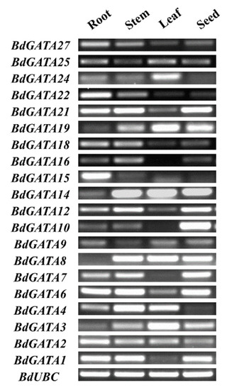 To detect the BdGATA gene expression profile in specific B. distachyon organs (roots, stems, leaves, and seeds), we performed a reverse-transcription polymerase chain reaction (RT-PCR) with the BdUBC gene as the internal control. As shown in Figure 6, BdGATA genes had different expressions in leaves, roots, stems, and seeds. For example, BdGATA1/6/21 showed similar expression patterns, which were at a high level in roots, stems, and seeds, but a low level in leaves. BdGATA2/25/27 were ubiquitously expressed in all tested organs, with varying transcript levels.