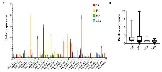 The expression of BdGATA genes was detected after treatment with different phytohormones. Compared to the other three hormone treatments, BdGATA10/16/18/20/24/28 showed more significant expression change after SA treatment. In addition, BdGATA6/8/12/17/21/27 showed significant expression change upon JA treatment (Figure 7A). To make the results more intuitive, we have shown the results of BdGATA gene expression after phytohormone treatments as a box–whisker plot containing a median (line) and interquartile range (box ends). According to Figure 7B, one can see clearly that BdGATA genes were strongly induced by JA and SA, but not abscisic acid (ABA) and indoleacetic acid (IAA).