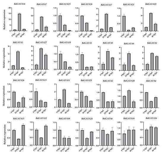 In addition, the transcription levels of BdGATA genes were detected in B. distachyon inoculated with M. oryzae isolate RO1-1 at 0, 24, and 48 h post inoculation (hpi). The relative expression of some BdGATA genes displayed significant induction at 24 and/or 48 hpi, such as BdGATA1/7/8/9/11/14/17/22/27; however, several GATA genes were induced at 24 but not 48 hpi (Figure 8). On the contrary, some BdGATA genes were suppressed after inoculation, for instance, BdGATA2/4/5/10/13/19/21/25/26/28 (Figure 8). On the whole, most of the BdGATA proteins might participate in B. distachyon disease resistance responses.