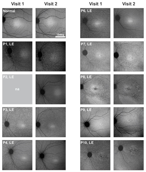En face near-infrared reduced illuminance autofluorescence (NIR-RAFI) images from the left eye of nine GUCY2D-LCA patients at two visits. Also shown are images of a normal eye acquired at ages 7 and 14 years. Images from Visit 1 of P2 and both visits of P5 were not available. The images from P1–P4 and P6 are within normal limits, and there is no obvious change on the second visit. Retinal pigment epithelium (RPE) abnormalities are present in the macula in P7, P8, P9, and P10 at Visit 1; no notable changes in appearance are evident in the images at Visit 2.