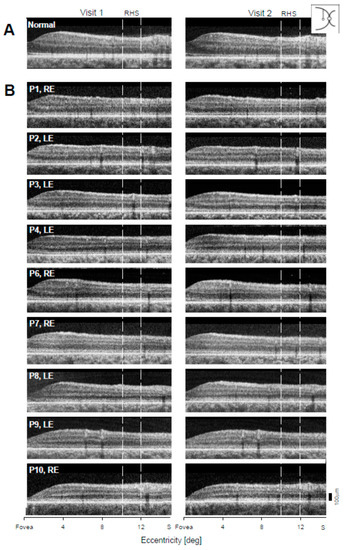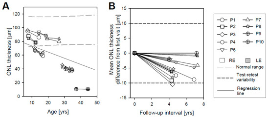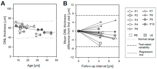 Average RHS ONL measurements from individual scans were plotted against age (Figure 5A); the results were also tabulated (Supplementary Table S2). In five patients, ONL thickness demonstrated small decreases in both eyes (P1: RE, 3.3, LE, 3.6 µm; P2: RE, 5.5, LE, 2.9 µm; P4: RE, 0.6, LE, 2.2 µm; P6: RE, 0.8, LE, 6.7 µm; P10: RE, 1.9, LE, 0.3 µm), while P3, P7, and P8 showed a small increase in average ONL thickness for the LE (4.1, 4.9, and 2.2 µm, respectively) and a decrease for the RE (1.2, 3.3, and 1.4 µm, respectively). P9 showed a small increase in average ONL thickness for the RE (1 µm) and a decrease for the LE (0.6 µm). For all nine patients, the change in ONL thickness was within the range of test–retest variability (7.13 µm), which was calculated in the same way as for the foveal region. Test–retest variability is shown (Figure 5B; horizontal short dashed lines). The difference in average RHS ONL thickness between RE and LE for both visits was within test–retest variability for all patients. There appeared to be a weak tendency for decreasing ONL thickness with age in the RHS region, and this was estimated with the same model as foveal ONL (Figure 5A, gray dashed line); the rate of decline was 0.29 µm/year (p = 0.01).