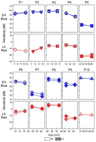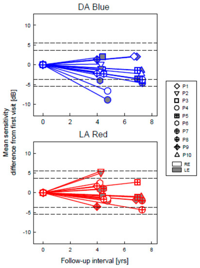 An overall analysis (combining all data from all eyes) for sensitivity change versus time after baseline was performed separately for LA Red and DA Blue stimuli. In the LA Red results, the effect of time was not significant (p = 0.26). In the DA Blue results, there was a small decreasing trend of 0.28 log units per decade (p ≤ 0.001). This tendency resembles data found in another form of LCA with seriously impaired vision [23].