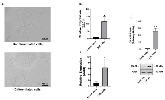 The human neuroblastoma SHSY5Y cells were differentiated by a sequential handling with retinoic acid (RA), followed by the brain-derived neurotrophic factor (BDNF) and B27 treatments. The RA, together with the low serum levels in the medium, induced the interruption of the cell cycle and the initial differentiation events; the subsequent BDNF/B27 treatment, in the total absence of serum, allowed the formation of a homogeneous population of neuron-like cells []. Figure 1a shows the changes in morphological features of differentiated SHSY5Y compared with undifferentiated ones. Differentiated cells had some long neuritic processes emerging from the cell body, coherent with increased expression of the microtubule-associated protein 2 (MAP2), a neuronal cytoskeletal marker (Figure 1d). Moreover, cell differentiation was verified by the mRNA level increase of the neuronal markers, TH and synaptophysin (Figure 1b,c).