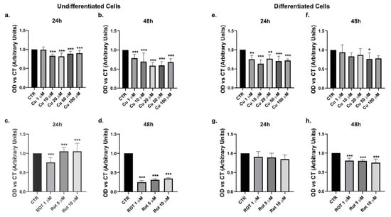 Effects of copper on cell viability (relative MTT assay). Undifferentiated SHSY5Y cells were treated with the indicated concentrations of copper or rotenone for 24 h (a,c) and 48 h (b,d). The same treatments were performed in differentiated cells, also in this case for 24 h (e–g) and 48 h (f–h). The results are presented as means ± SD of seven replicates; values were compared with untreated cells (CTR) by one-way ANOVA following Tukey test * p < 0.0332 ** p < 0.0021 *** p < 0.0002, compared to untreated cells (CTR).