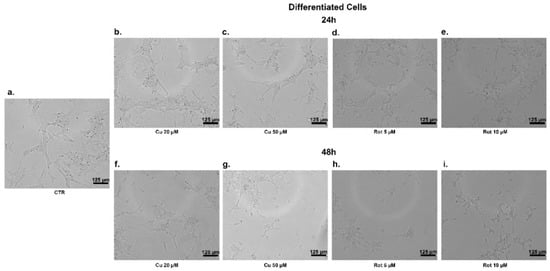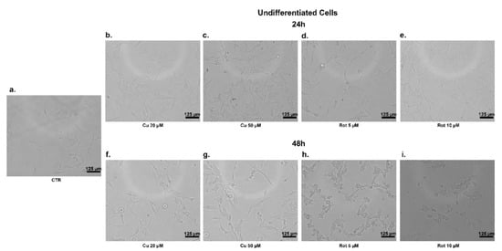 In the undifferentiated cells, at 24 h, neither copper nor rotenone significantly affected their morphology and viability (Figure 3b–e and Figure 4b–e); similarly, 48 h of copper treatment caused no change in cells shape (Figure 3f,g) compared to untreated ones (Figure 3a). At 48 h of treatment with rotenone, we observed that the SHSY5Y cells changed their form, becoming rounder, partially detached from monolayers, and floated in the medium (Figure 3h,i). No morphological alterations to differentiated cells were evident in any of the conditions considered (Figure 4a–i).
