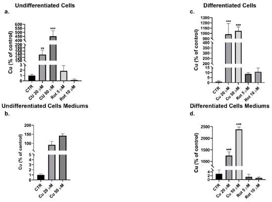 Following exposure of the undifferentiated and differentiated cells to copper or rotenone, the metal content in intracellular (Figure 5a,c) and extracellular media (Figure 5b,d) was determined by the atomic absorption spectrometry. The intracellular metal concentration increased significantly, in a dose-dependent manner, after extracellular copper incubation (Figure 5a). To note, the copper uptake was greater in the differentiated SHSY5Y (Figure 5c), to confirm their increased metal demand, probably due to the presence of copper-dependent enzymes involved in neurotransmitter production [].