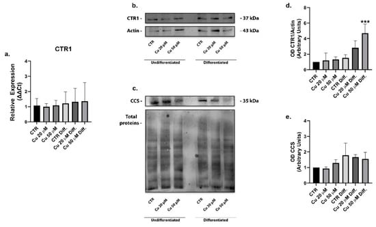 Intracellular copper uptake is primarily mediated by the CTR1, an evolutionarily conserved transporter acting ubiquitously in all tissues []. The expression of CTR1 was analyzed in the undifferentiated and differentiated cells treated with 20 or 50 µM copper for 48 h. While no significant changes in mRNA levels were observed (Figure 6a), the protein was increased 1.6-fold upon differentiation and of 2.9- and 4.8-fold after incubation with 20 or 50 µM copper, respectively, in comparison with the undifferentiated SHSY5Y (Figure 6b,d). The increase observed in differentiated cells following treatment with 50 µM copper is significant. Therefore, the differentiation process and copper supplementation induced a significant increase of the CTR1 protein expression.