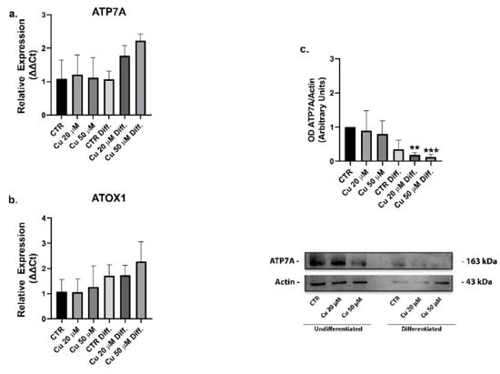 The cytosol chaperone Atox1 shuttles copper to the ATP7A transporter that, by hydrolyzing ATP, can translocate copper toward the trans-Golgi network to support the metalation of emerging apoproteins, the activation of copper-dependent enzymes or the removal of copper excess from the cell. Altogether, this is defined as secretory pathway [,]. Although it was known that the ATP7A levels in differentiating cells were increased in response to RA, but not BDNF [], the supplemental copper could be sent to the secretory pathway. On the contrary, the mRNA levels of Atox1 and ATP7A (Figure 7a,b) did not vary significantly in our experimental conditions and the western blot analyses highlighted a significative reduction of protein ATP7A in the differentiated and copper treated cells (Figure 7c). The gene encoding for ATP7A was known to be strongly responsive to the RA β2 receptor; this finding could explain the high levels of the transporter described in the literature after RA treatments. The differentiation we carried out, foreseeing a final step without RA, allowed a return of the protein expression to more physiological levels [].