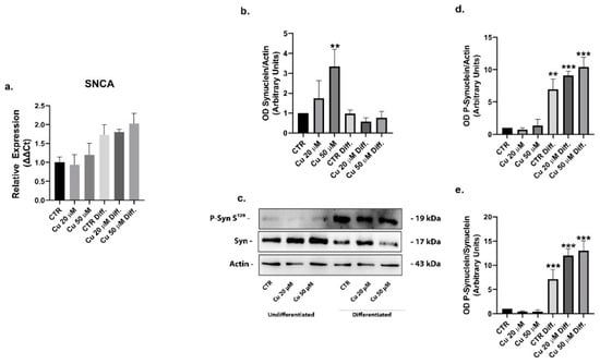 Copper treatment increased phospho-α-synuclein levels in differentiated SHSY5Y cells. mRNA relative expression of α-synuclein gene (SNCA) in undifferentiated and differentiated cells incubated with 20 or 50 µM copper (a). Representative immunoblots of the α-synuclein and phospho-α-synuclein protein (c) and densitometric analysis of bands representing means ± SD of three independent experiments (b,d,e). β-actin was used as loading control. Values were compared with untreated cells (CTR) by one-way ANOVA following Tukey test ** p < 0.0021 *** p < 0.0002.