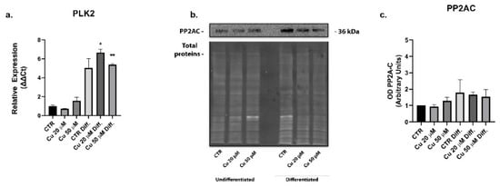 To justify this result, the cellular expressions of PLK2 kinase, involved in phosphorylation at the residue S129 of α-synuclein and the relative phosphatase PP2A, were analyzed. PP2A western blots did not show a significant variation between the different conditions (Figure 9b,c), whereas the expression of PLK2 was upregulated in both the untreated and copper treated differentiated cells (Figure 9a).