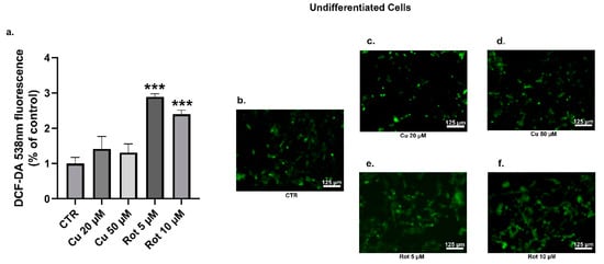 Undifferentiated SHSY5Y cells DCFDA analysis. The relative intensity of DCF was employed to evaluate the reactive oxygen species (ROS) levels. Cells were treated with 20 or 50 µM copper (c,d) or 5 or 10 µM rotenone (e,f) and compared to untreated cells (b). Fluorescence values were normalized on total protein (a). Values were compared with untreated cells (CTR) by one-way ANOVA following Tukey test *** p < 0.0002.