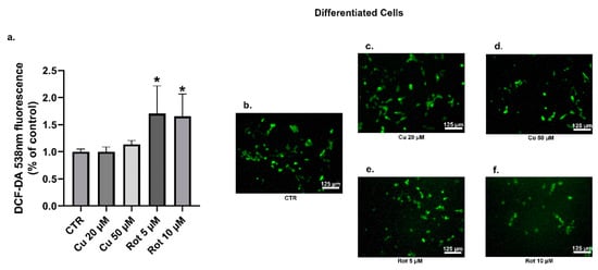 Differentiated SHSY5Y cells DCFDA analysis. The relative intensity of DCF was employed to evaluate the ROS levels. Cells were treated with 20 or 50 µM copper (c,d) or 5 or 10 µM rotenone (e,f) and compared to untreated cells (b). Fluorescence values were normalized on total protein (a). Fluorescence values were normalized on total protein (a). Values were compared with untreated cells (CTR) by one-way ANOVA following Tukey test * p < 0.0332.