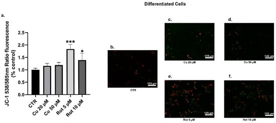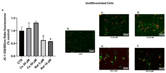 Undifferentiated SHSY5Y cells JC-1 analysis. The JC-1 staining was used to assess the mitochondrial membrane potential (MMP) cells were treated with 20 or 50 µM copper (c,d) or 5 or 10 µM rotenone (e,f) and compared to untreated cells (b). The percentages of JC-1 monomers presented the percentages of SHSY5Y cells with low MMP. Fluorescence values were normalized on total protein (a). Values were compared with untreated cells (CTR) by one-way ANOVA following Tukey test * p < 0.0332.