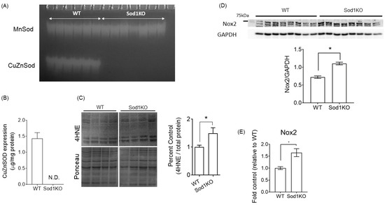 Elevated oxidative modifications in mouse hearts lacking superoxide dismutase1, Sod1 knockout or Sod1KO. (A) Activity gel for CuZnSOD enzyme in heart lysates from WT and Sod1KO mice (n = 6–8). (B) CuZnSOD protein contents determined by targeted mass spectrometry (n = 7–8). (C) Top: Representative blot images of molecular weights 150–40 kDa. Bottom: Quantification of the 4HNE products in heart lysates (n = 7–8). Entire lanes were quantified to determine the 4HNE-conjugated proteins. (D) Expression of Nox2 proteins and (E) mRNA expression, determined by qRT-PCR in the heart lysates of WT and Sod1KO mice (n = 8). Data are mean ± SEM. * p < 0.05. Abbreviations: Sod = superoxide dismutase; Nox = NADPH oxidase; 4HNE = 4-Hydroxynonenal.
