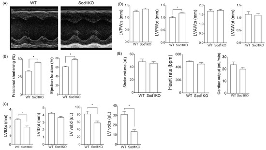Sod1KO has been shown to increase oxidative stress in the skeletal muscles and leads to skeletal muscle atrophy with age, along with decreased specific force [17]. To determine the effect of Sod1KO on the heart, we analyzed the cardiac systolic function by echocardiography. The analysis of cardiac function revealed increased ejection fraction and fractional shortening in the Sod1KO mice (Figure 2A,B). The internal diameter and left ventricular volume were significantly lower in the knockout mice at systole (Figure 2C), while there was a slight but significant increase in the left ventricular posterior wall thickness in the Sod1KO hearts during systole and diastole (Figure 2D). The net results of the reduced LV volume and the increased cardiac systolic function were unchanged stroke volumes. Cardiac output remained similar between WT and Sod1KO, with similar heart rates (Figure 2E).