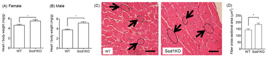 Increase in heart weights in Sod1KO mice. (A,B) Heart weights normalized to body weight significantly increased for both male and female mice (n = 6–8). (C) H&E-stained representative cross-section images of hearts from WT and Sod1KO mice. Fibers with central nuclei were analyzed for equal comparisons for fiber cross-sectional area (CSA). Arrows indicate fibers with central nuclei. The scale bar indicates 50 µm. (D) Myocyte CSAs were calculated from circumferences of myocytes with round and central nuclei (n = 4). We analyzed 15–25 fibers from each mouse to determine the mean fiber CSA from each group. * p < 0.05. Data are mean ± SEM.
