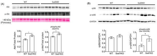 Sod1KO hearts exhibited the upregulation of Akt and ribosomal protein synthesis. (A) Top: Immunoblot images for total Akt and phosphorylated Akt. Bottom: Quantified data for total Akt and phosphorylated at Ser473, normalized by total proteins, were increased in Sod1KO hearts (n = 8). (B) Top: Immunoblot images for total rpS6 and phosphorylated rpS6. Bottom: quantified data for rpS6 and phosphorylated rpS6 at Ser235/236 normalized by GADPH (n = 8). * p < 0.05. Data are mean ± SEM. Abbreviations: Akt = serine–threonine kinase; rpS6 = ribosomal protein synthesis S6.