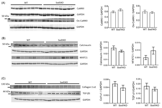 Sustained and prolonged stress or injury (pressure and volume overload) leads to decompensated hypertrophy and dilated cardiomyopathy with excessive fibrosis, cardiac dysfunction, and maladaptive gene and protein expression, including an increase in CaMKII activity, TGF-β1, and collagen 1 expression [22]. The expression of total CaMKII or oxidized (activated) CaMKII was unchanged in the hearts of the Sod1KO mice (Figure 6A), as was the expression of calcineurin (Figure 6B). We observed no increase in collagen 1 content or in the expression of the pro-fibrotic growth factor TGF-β1 in the hearts of the Sod1KO mice (Figure 6C). Real-time PCR also showed no significant change in collagen 1 or TGF-β1 mRNA expression in the hearts (Figure S2).