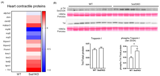 The heart contractile proteins involved in calcium-medicated force modulations were determined using targeted mass spectrometry. Vinculin was upregulated by ~30% in the Sod1KO hearts, while the rest of the contractile proteins we tested remained unchanged (Figure 7A). Phosphorylation of cardiac troponin I (cTnI) increased by ~80% in Sod1KO hearts (Figure 7B). Increased vinculin expression and cTnI phosphorylation may be associated with the increased systolic function in Sod1KO hearts. We further determined the expression of proteins and enzymes involved in β-oxidation, Krebs cycle, and carbohydrates, in which several enzymes were upregulated (Figure S3). The mitochondrial superoxide scavenger Sod2 remained unchanged, but several other antioxidant enzymes increased in Sod1KO hearts (Figures S3 and S4), as shown in other tissues challenged by redox imbalance [23,24].