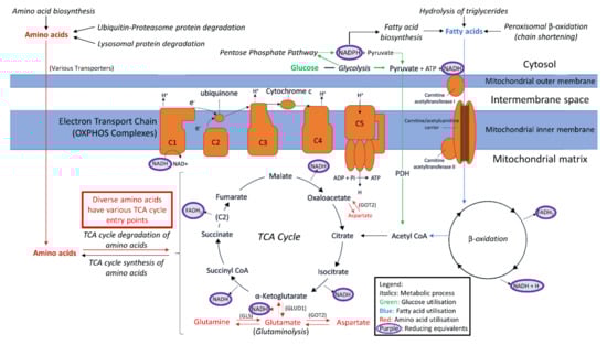 Amino acids may be metabolised to feed into the TCA cycle as sources of oxidisable substrate for respiration, or to participate in the replenishment of other metabolic intermediates. Glutamate is the metabolic product of multiple amino acids, prominent among which is glutamine [13,14]. The conversion of glutamine to glutamate by glutaminase (GLS) [14] and subsequent conversion to the TCA cycle intermediate α-ketoglutarate (α-KG) by glutamate dehydrogenase (GLUD1) is an important mechanism through which the TCA cycle can utilise amino acids to assist with driving mitochondrial energy production [15]. This reaction simultaneously reduces NAD+ to NADH, and so doubles as another direct means of replenishing reducing equivalents for OXPHOS. The functions of GLS and GLUD1 in tandem are therefore important for both direct mitochondrial NADH replenishment and as a major route of amino acid entry into the TCA cycle. This mechanism is regulated according to cellular energy demand, with GLUD1 activity mainly controlled allosterically-negatively by GTP and positively by ADP [16].