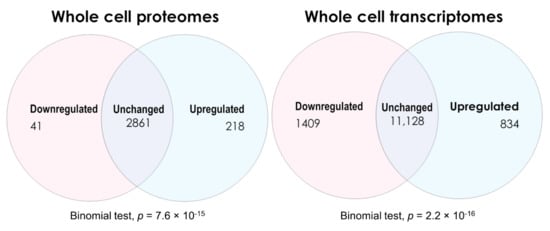 Up- and downregulated lists of genes and proteins from both the proteomics and transcriptomics experiments were determined by applying the Benjamini–Hochberg step-up correction for multiple comparisons (with q < 0.05) to the significance probabilities from t tests in the proteomics or F tests in the transcriptomics [26]. The numbers of differentially expressed vs. unchanged gene products detected in ME/CFS lymphoblasts across both types of experiment are shown in Figure 2. Comparing the whole-cell proteomes of ME/CFS and healthy control lymphoblasts revealed 218 upregulated, 41 downregulated, and 2861 proteins whose levels were unchanged. The expression of significantly more proteins was upregulated than downregulated (binomial test). Conversely, the transcriptomics revealed 843 transcripts upregulated, 1409 downregulated, and 11,128 unchanged—significantly more downregulated than upregulated (binomial test, null hypothesis—equal up- and downregulated proportions).