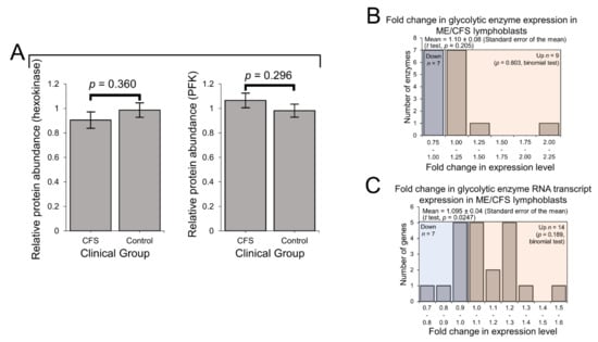 Protein-level expression of glycolytic enzymes is unchanged in Myalgic Encephalomyelitis/Chronic Fatigue Syndrome (ME/CFS) lymphoblasts. Error bars represent the standard errors of the mean. RNA sequencing transcriptomics experiment: ME/CFS n = 23, control n = 17. Each cell line was sampled once. Mass spectrometry proteomics experiment: ME/CFS n = 34, control n = 31. Each cell line was sampled once, or twice for a subset of healthy controls arbitrarily selected to act as an internal control between experiments in the proteomics work. (A) The expression level of hexokinase and phosphofructokinase is unchanged in whole-cell mass spectrometry proteomics experiments (independent t test). Relative hexokinase (HK) and phosphofructokinase (PFK) abundance was calculated by averaging the mean fold change in the ME/CFS group for each isoenzyme/subunit of the respective enzyme (none of which were statistically significant on their own, threshold p < 0.05). (B) A total of 16 glycolytic enzymes were detected within the whole-cell proteomes of lymphoblasts from ME/CFS and control lymphoblasts. Fold change refers to the mean abundance of a given protein in the CFS group divided by the mean abundance in the control group. There was no significant difference in the differentially expressed proportions of detected glycolytic enzymes (binomial test with Ho set to 0.5) or the magnitude of expression (single-sample t test with Ho m = 1) between ME/CFS and controls. (C) A total of 21 RNA transcripts encoding glycolytic enzymes were detected by RNA sequencing within the whole-cell transcriptomes of ME/CFS and control lymphoblasts. Mean fold change was calculated for the ME/CFS group versus the control average for each transcript. The proportion of detected transcripts that were upregulated (binomial test with Ho set to 0.5) was not significant while the average extent of the upregulation (single-sample t test with Ho m = 1) was statistically significant.