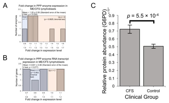Glucose tracer experiments by others have shown that when B cells switch their metabolism in favour of fatty acid β-oxidation instead of towards glycolysis, glucose is utilised at the same overall rates, but by the PPP instead [40,41]. In ME/CFS research, reports of reduced glucose [4] and disaccharides [10] in patient blood could reflect elevated utilisation of the PPP if the rate of glycolysis is indeed unchanged in patient cells as we have observed. In any case, compensatory provision of additional pyruvate is one means by which the PPP may be utilised to support respiration as a source of oxidisable substrate in ME/CFS lymphoblast mitochondria whose mitochondrial ATP synthesis is inefficient [2]. PPP enzymes were also significantly over-represented among the upregulated fraction of proteins across the entire proteomics experiment (Table S4). This was confirmed when we selected all PPP enzymes that were detected in the proteome and examined their expression levels in the lymphoblast proteomes and transcriptomes. With mean levels 20 ± 9% higher than controls (t test, p = 0.034) (Figure 4A), PPP enzymes were significantly upregulated in the proteomes of ME/CFS lymphoblasts, while their expression was not significantly altered at the transcriptional level (Figure 4B). Importantly, glucose-6-phosphate 1-dehydrogenase (G6PD), the enzyme catalysing the first and rate-limiting step of the oxidative arm of the PPP [42], was significantly elevated on its own by 43 ± 10% in the proteomes of ME/CFS lymphoblasts versus healthy controls (p = 5.5 × 10−4) (Figure 4C). This suggests that the PPP is indeed upregulated as an alternative means of glucose utilisation to glycolysis in ME/CFS lymphoblasts.