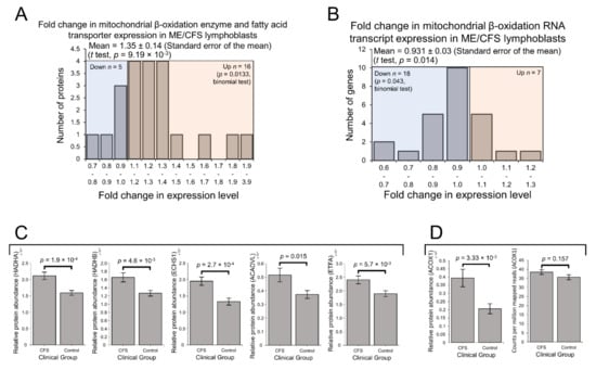 Enzymes involved in mitochondrial fatty acid β-oxidation were upregulated in ME/CFS lymphoblasts in our preliminary proteomics experiment [2]. Preferential fatty acid β-oxidation is the canonical metabolic alternative to glycolysis and is consistent with the previously reported upregulation of the PPP in B cells [40,41], from which lymphoblasts are derived. Given also its prominence in the exploratory pathway over-representation analysis, we strongly anticipated the expression of enzymes and transporters involved in mitochondrial fatty acid β-oxidation would be elevated in this larger sample of ME/CFS lymphoblasts. Indeed, here we found expression of these proteins to be significantly elevated in the ME/CFS group (Figure 5A). A total of 16 of the detected 21 proteins were upregulated (binomial test, p = 0.0133), with mean levels 35 ± 14% higher than controls (t test, p = 9.19 × 10−3). In contrast with the elevated protein expression and in keeping with the broader transcriptional trends, the levels of mRNA transcripts encoding these enzymes was found to be slightly reduced (Figure 5B). A total of 18 of the detected 25 transcripts were downregulated (binomial test, p = 0.043) with mean levels 9 ± 3% lower than controls (t test, p = 0.014). This suggests upregulation specifically at the translational level, as was apparent with other groups of proteins such as OXPHOS Complexes I, III, IV and V.