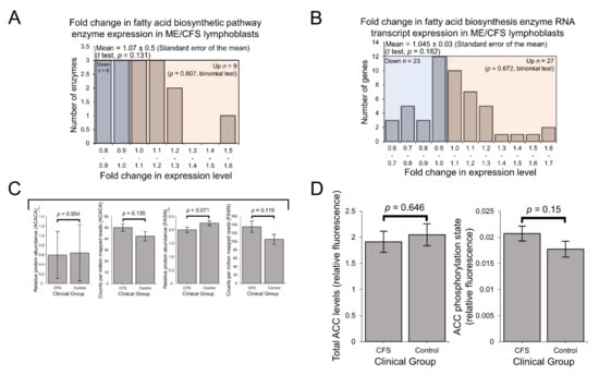 Particularly important among the involved enzymes are acetyl-CoA carboxylase 1 (ACC1), which catalyses the synthesis of malonyl-CoA—a key, rate-limiting substrate for fatty acid synthesis, and fatty acid synthase (FASN), which in turn catalyses the conversion of malonyl-CoA to palmitate [51,52]. Thus, these reactions control the rate of de novo fatty acid biosynthesis by the cell and their expression levels are important to investigate on an individual basis to assist with inferring functional consequences. In the whole-cell proteomes, the expression of ACC1 (ACACA) in ME/CFS lymphoblasts was unchanged compared to controls (albeit detected at low levels) and was also unchanged at the transcriptional level (Figure 6C). The unchanged expression of the ACC protein was later confirmed in a plate-based fluorescence assay (Figure 6D). Expression levels of FASN were also not significantly different at either the protein or transcript level (Figure 6C). Since fatty acid biosynthesis is selectively activated in competition with fatty acid β-oxidation [22,53] and mitochondrial fatty acid β-oxidation enzymes are upregulated in ME/CFS lymphoblasts, it is unsurprising that expression of these enzymes involved in fatty acid biosynthesis are not elevated. These observations together suggest that in ME/CFS lymphoblasts compared to controls, fatty acid metabolism is indeed operating in favour of β-oxidation rather than biosynthesis.