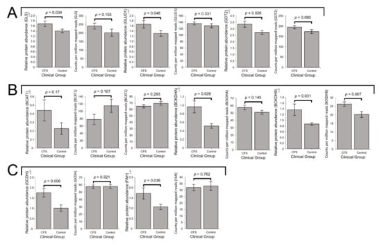 As detailed earlier, the key enzymes involved in glutamine/glutamate degradation are 1) GLS, responsible for metabolising glutamine to glutamate, 2) GLUD1, which converts glutamate to the TCA cycle substrate α-KG and replenishes NADH, and 3) GOT2, the mitochondrial enzyme simultaneously catalysing the conversion of glutamate to aspartate and oxaloacetate to α-KG (Figure 1). In ME/CFS lymphoblasts, the levels of each of these three enzymes were significantly elevated in the proteomes (p < 0.05 in all cases, fold increases ranging from 20 to 27%), while the levels of the transcripts encoding them also trended upwards but did not reach statistical significance in all three cases (Figure 7A). Together with the absence of changes in glycolysis, this observation may confirm previous proposals that in ME/CFS, relative to glycolysis, specific amino acids and their derivatives are more heavily utilised as a mitochondrial fuel source [4].