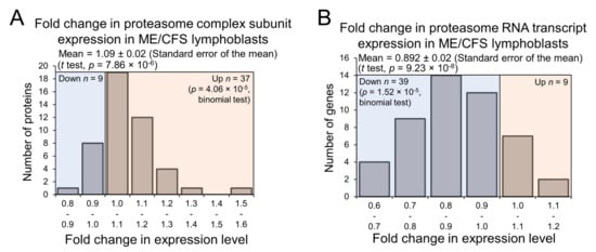 Expression of proteasome complexes in Myalgic Encephalomyelitis/Chronic Fatigue Syndrome (ME/CFS) lymphoblasts is upregulated at the protein level but downregulated at the transcript level. Error bars represent the standard error of the mean. RNA sequencing transcriptomics experiment: ME/CFS n = 23, control n = 17. Each cell line was sampled once. Mass spectrometry proteomics experiment: ME/CFS n = 34, control n = 31. Each cell line was sampled once, or twice for a subset of healthy controls arbitrarily selected to act an internal control between experiments in the mass spectrometry proteomics work. (A) A total of 46 proteasome complex subunits were detected within the whole-cell proteomes of ME/CFS and control lymphoblasts. Fold change refers to the mean abundance of a given protein in the CFS group divided by the mean abundance in the control group. The fraction of detected proteins that were upregulated (binomial test with Ho set to 0.5) and the average extent of the upregulation (single-sample t test with Ho m = 1) were statistically significant. (B) A total of 48 RNA transcripts encoding proteasome complex subunits were detected within the whole-cell transcriptomes of ME/CFS and control lymphoblasts. Fold change refers to the mean abundance of a given transcript in the CFS group divided by the mean abundance in the control group. The fraction of detected transcripts that were downregulated (binomial test with Ho set to 0.5) and the average extent of the downregulation (single-sample t test with Ho m = 1) were statistically significant.