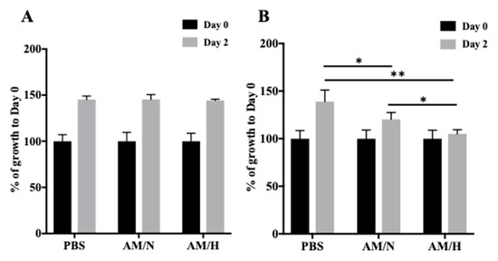 Recent findings have shown the anti-fibrotic potential of exosomes isolated from in vitro cultured amniotic membrane-derived cells [42,43,44]. To understand if the exosomes isolated from AM tissues have anti-fibrotic activity, we used the LX-2 cell line, which is a widely used human hepatic stellate cell line for studying fibrotic responses [45]. We first examined the effect of AM exosomes on LX-2 cell proliferation. As shown in Figure 2A, the presence of exosomes (AM/N or AM/H) did not affect the growth of LX-2 (Figure 2A). The proliferation of LX-2 in the presence or absence of exosomes was also analyzed by Click-iT™ EdU cell proliferation kit for imaging. Cells showed a similar level of proliferation (Supplemental Figure S1A). It has been shown that LX-2 cells can be activated by the treatment of TGF-β1, which induces a transition of LX-2 cells from a quiescent (non-activated) state to a myofibrotic (activated) state which mimics the onset of the fibrosis process [47]. When LX-2 cells were activated by the treatment of 4 ng/mL of TGF-β1, the presence of exosomes inhibited the growth of LX-2 cells (Figure 2B and Supplemental Figure S1B). Interestingly, the AM/H exosomes showed a slightly stronger inhibitory effect on the growth of activated LX-2 cells. These results indicated that exosomes counteract the effect of TGF-β1 on the growth of LX-2 cells.