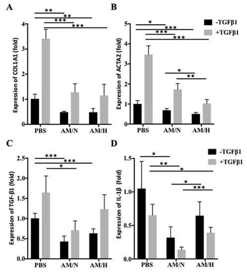 In order to determine whether the AM exosomes carry anti-fibrotic activities, the expression of fibrotic markers in LX-2 cells was evaluated in the presence or absence of AM exosomes. The expressions of fibrotic markers in non-activated and activated LX-2 cells were also compared (Figure 3). COL1A1 (type I collagen) and ACTA2 (alpha smooth muscle actin) are the most commonly used fibrotic markers [48]. The treatment of TGF-β1 increased the expression of COL1A1 in LX-2 cells (Figure 3A, first and second columns), and the presence of AM exosomes reduced the expression of COL1A1 in both non-activated and TGF-β1-activated LX-2 cells. Strikingly, the treatment of activated LX-2 cells with AM exosomes brought down the gene expression levels to be similar to those of non-activated LX-2 under control conditions (PBS). However, the effect of AM/N versus that of AM/H on LX-2 cells was not significantly different (Figure 3A). Similarly, the treatment with TGF-β1 increased the expression of ACTA2 in LX-2 cells (Figure 3B, first and second columns). The presence of AM exosomes reduced the expression of ACTA2 in non-activated or TGF-β1-activated LX-2 cells. More interestingly, AM/H exosomes demonstrated a stronger inhibitory effect on the expression of ACTA2 in LX-2 compared with AM/N exosomes. The expression of another fibrotic marker, TGF-β1, adopted a similar pattern to that of COL1A1 (Figure 3C). The role of IL-1β in fibrosis seems to be less unified. Both pro-fibrotic and anti-fibrotic activity of IL-1β have been reported [49]. Activation of LX-2 by TGF-β1 did not increase the expression of IL-1β (Figure 3D). Instead, the activated cells showed a decreasing trend, and the presence of AM exosomes decreased the expression of IL-1β even further. Unlike its effect on the expression of ACAT2, AM/N showed a stronger inhibitory effect on the expression of IL-1β than that of AM/H. These results suggested the role of AM exosomes in reducing the expression of pro-fibrotic markers in LX-2 cells.
