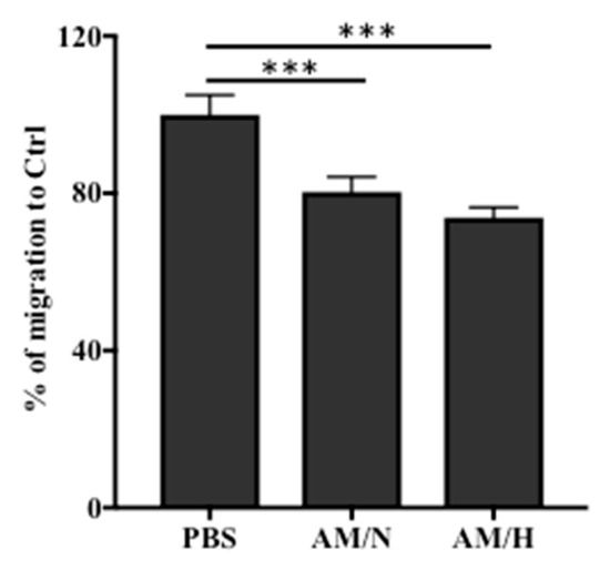 Enhanced migration of LX-2 cells is often associated with the progression of fibrosis [45]. To evaluate anti-fibrotic activity of AM exosomes, we also assessed the migration of LX-2 cells using a scratch wound assay. As shown in Figure 5 and Supplemental Figure S2, the presence of exosomes reduced the migration of LX-2 by about 20% (AM/N) and 26% (AM/H). This result suggested that AM exosomes carry anti-fibrotic activity to inhibit the migration of LX-2 cells.