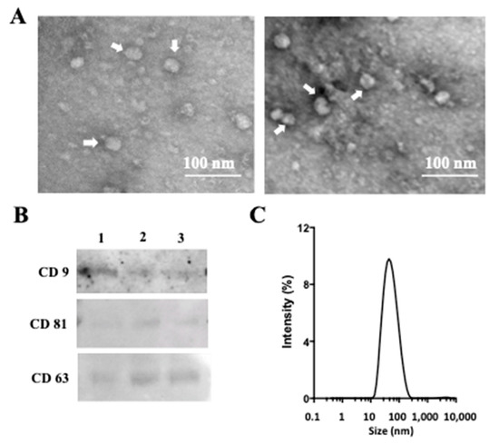 Exosomes in PBS were diluted using pure water at 1:5. Five microliters of diluted exosomes were dropped onto a formvar-carbon coated 300-mesh copper grid (Electron Microscopy Sciences, Hatfield, PA, USA) and left to dry at room temperature for 2 min. The exosome samples were stained using Uranyl acetate 2% solution (Electron Microscopy Sciences, Hatfield, PA, USA). The grids were dried at room temperature (RT) and then viewed in a Philips CM12 electron microscope with AMT-XR11 digital camera.